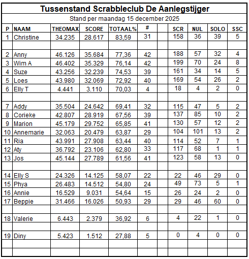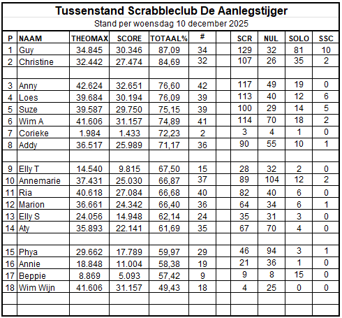 Hieronder zie je alle gespeelde wedstrijden van Scrabbleclub Aanlegstijger van de tweede helft van 2025.